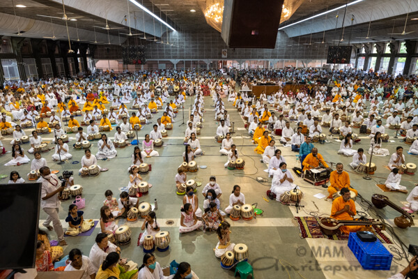 A total of 265 ashramites participated in Nadapuja, a musical offering that included, everyone from small kids to the elderly. 165 tabla players, 75 kaimani players, 6 singers, 14 harmonium players, and a keyboard, mridangam, veena and edakka player – all performed 3 bhajans beautifully in unison as Amma and the rest of the ashram watched in awe and appreciation.
