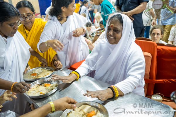 Amma arrived in Nagercoil after completing her program in Thiruvananthapuram. As soon as she reached the venue, she lovingly served prasad to the tour group members and volunteers, singing bhajans and sharing moments of joy with laughter, jokes, and reflections on Gita slokas.