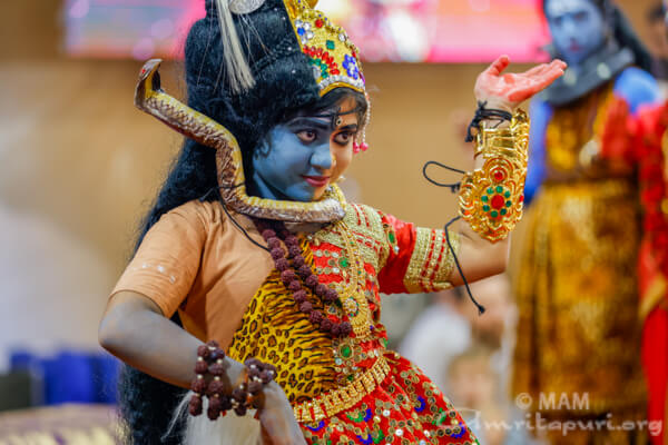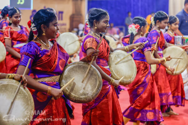 Amma then began giving darshan, embracing thousands of devotees throughout the night. During darshan time, students of Amrita Institutions presented various cultural programs, including the traditional “Villadichampattu”, a musical storytelling performance where young boys narrated Amma’s life story in a captivating way.There was Annadānam – free food for all the devotees