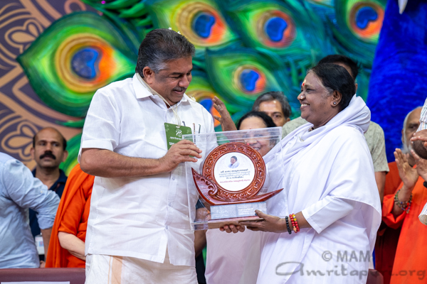 Presenting the honor on behalf of the state, Saji Cherian, Minister for Culture & Youth Affairs, said, “Amma has shown the strength of the Malayalam language and culture to the entire world. Her use of Malayalam on the global stage was also a powerful message to those who neglect their mother tongue. This is not merely a felicitation—it is a cultural awakening.” He added that the Chief Minister conveyed his respects and greetings.