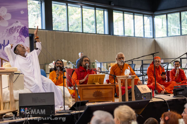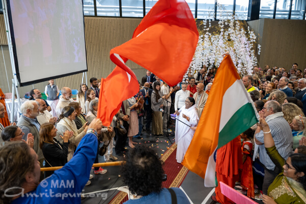 The next day, Amma was officially welcomed to Zurich. Devotees formed an aisle to the stage, holding white cloth flowers tied to long twigs. The hall resounded with the a big Swiss Alp Horn, cowbells, yodeling, and Talerschwingen, while Indian and Swiss flags waved in greeting. Among those present were the Indian Ambassador to Switzerland, Mridul Kumar; Dr. Agosti, founder and chief physician of the Hirslanden Headache Center and a member of the Canton of Zurich parliament; and actress Zoë Pastelle, one of Switzerland’s best-known content creators.