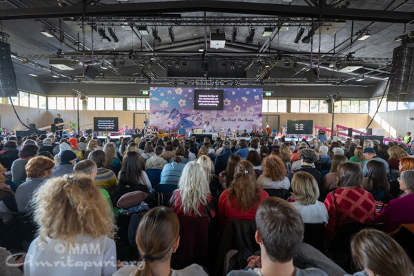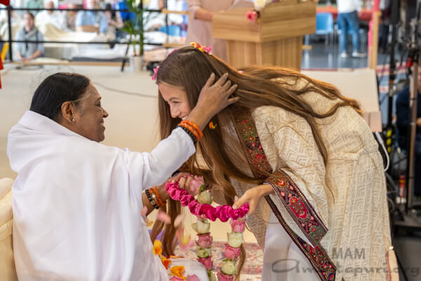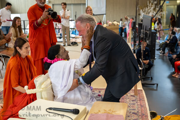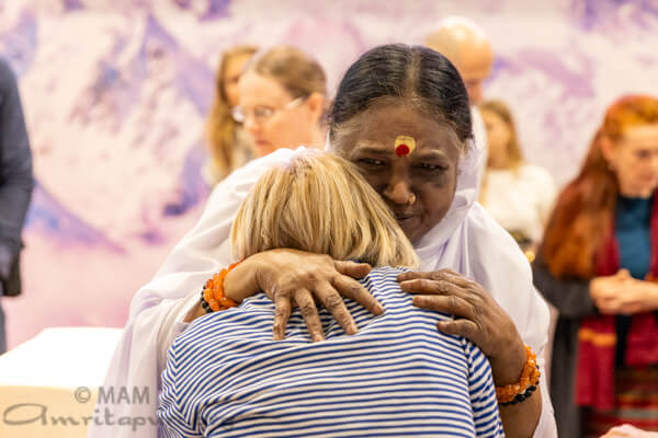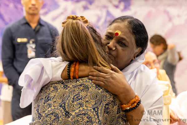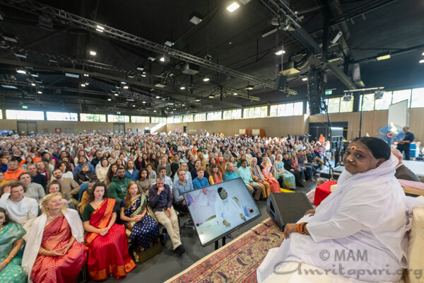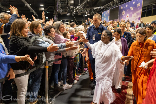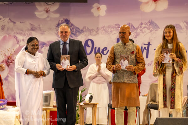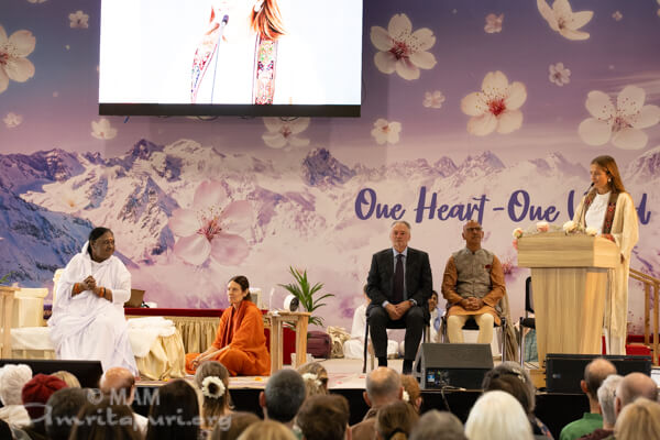 Addressing the crowd, Zoë Pastelle said: “Amma, In your speech at the Parliament of World Religions in Barcelona, you said: ‘Love is our true essence. Love knows no boundaries such as religion, skin color, nationality, or caste. We are all pearls strung on the same thread of love. To recognize this unity and to carry the love that is our true nature into the world — that is the goal of human life.’ These words are more relevant than ever in our world, where the gap between rich and poor is widening every day, where there is so much violence and harmony in nature is disrupted. I hope that we all awaken to this all-encompassing love. So that our world is peaceful, that our beautiful planet is protected, and that our children can also experience this beauty.” The hall responded with thunderous applause.