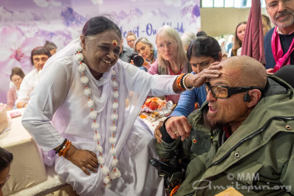 A Swiss man came alone in a wheelchair. Formerly a hockey player, a car accident left his legs paralyzed and his hands difficult to control. Amma showered him with love and attention. It was his third time meeting Amma.