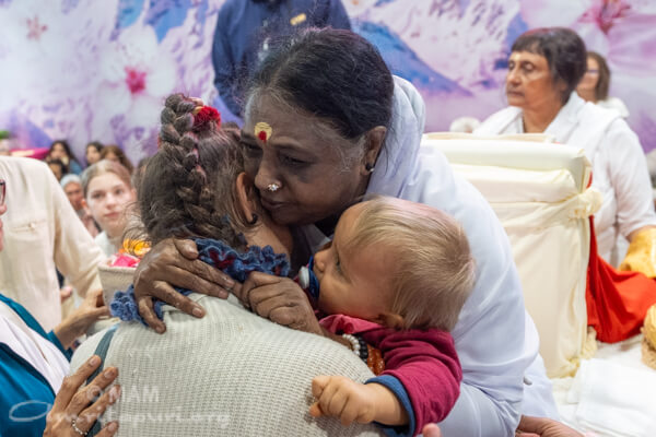 The crowd overflowed the main hall, and the adjacent dining hall was also filled with devotees watching on the big screen. Infants and elders alike braved the cold, with temperatures between 4 and 10 degrees. The youngest noted infant was 15 days old. Many waited for hours to see Amma, shedding tears of reunion, love, hope, and conviction.