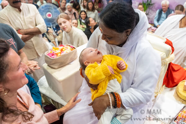 Each day, many took mantra from Amma—nearly 900 in total. One touching moment was a family receiving mantra together; the oldest was 6 years and the youngest child was under two and not yet speaking, yet Amma gave mantra to the baby, honoring the parents’ commitment to spiritual values.