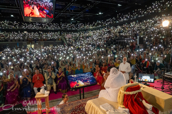 For the Atma Puja, when Amma arrived, the stadium shimmered with mobile phone lights and applause. Amma lit the ceremonial lamp for the puja. Waves of tiny lights moved across the arena—like millions of stars in a dark sky—signaling joy and hope.