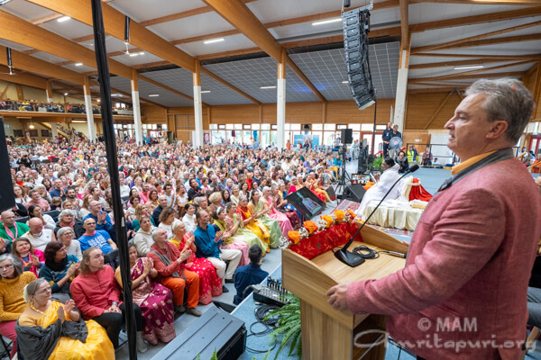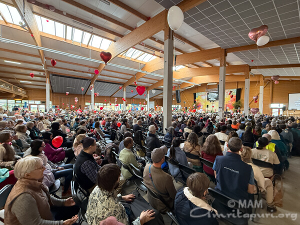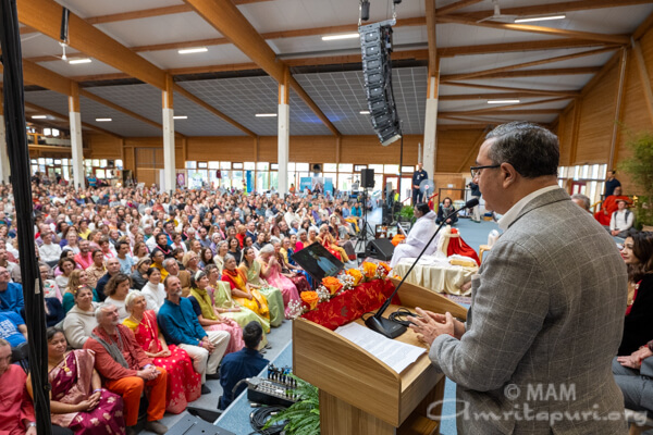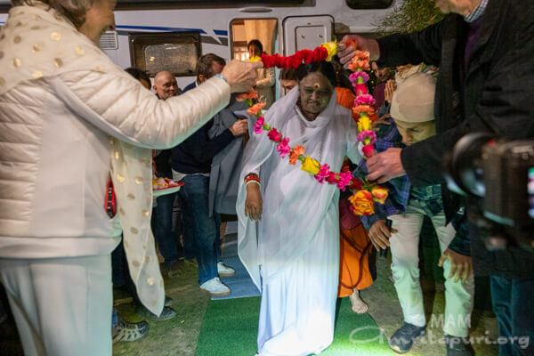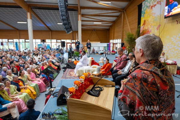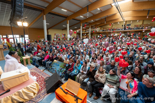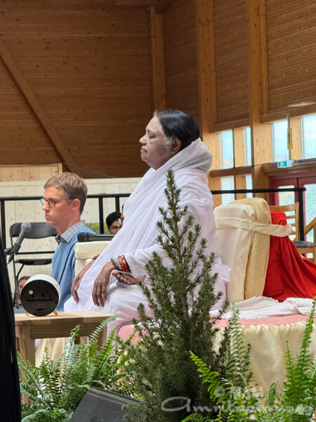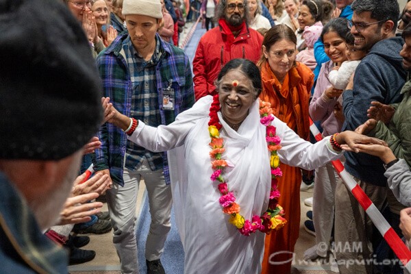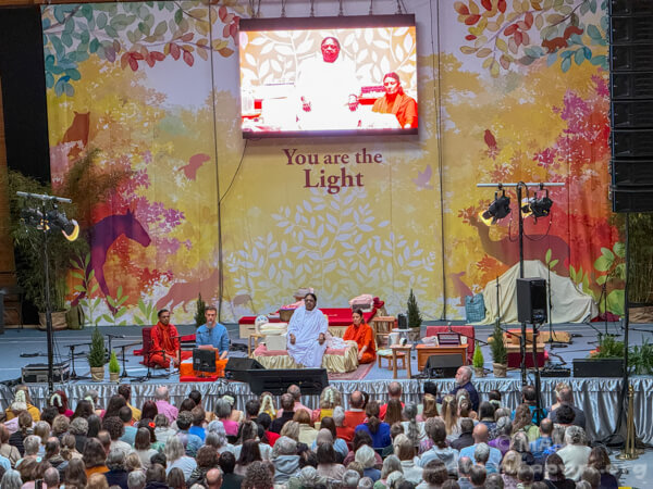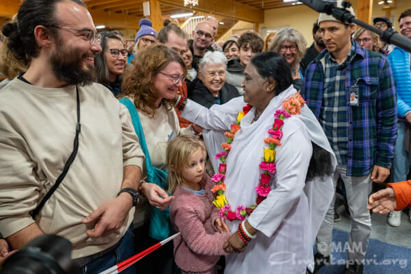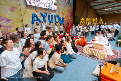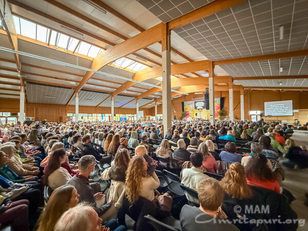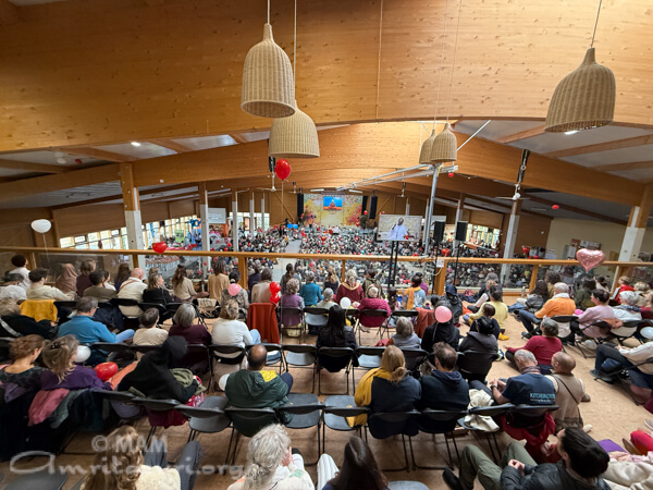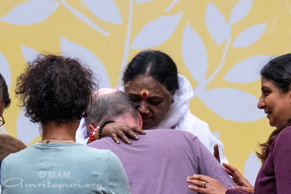 Amma led satsang, bhajans, a guided meditation, and Atma Puja, offering solace and strength to all who attended. She also sang a German bhajan, filling the hall with emotion as many sang along through tears.