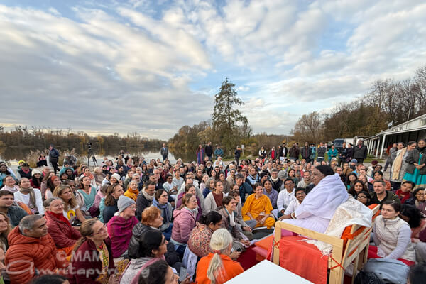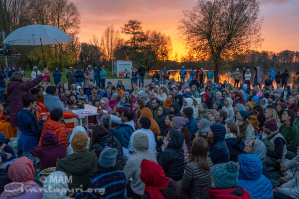 After completing the Italy program, Amma began her journey toward MA Center Germany in Brombachtal. On the way, Amma made a stop in Achern, where everyone gathered by a tranquil lakeside for lunch. As Amma lovingly served the meal, the group sang bhajans and meditated in the serene atmosphere. By the time Amma finished serving, the sky had turned into a brilliant tapestry of orange and deep red—an unforgettable sunset that felt like nature itself offering pranams.
