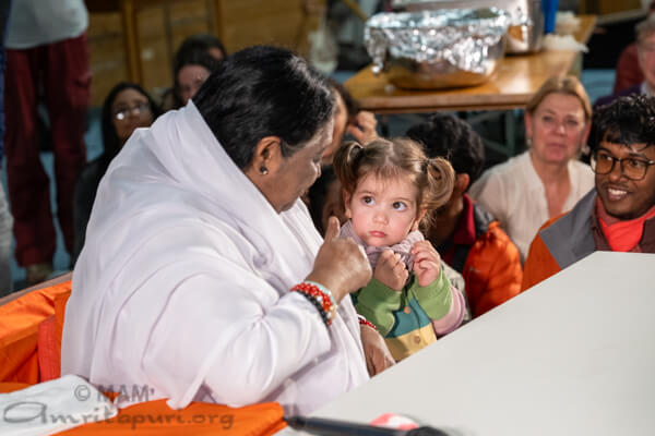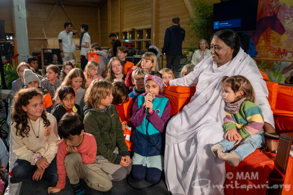 That evening, Amma arrived at Brombachtal Ashram, where dinner was served upon arrival. A large group of children came eagerly onto the stage to sit near Amma, singing bhajans with innocent joy as Amma smiled and clapped along.