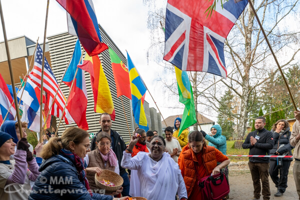 The following morning, Amma was welcomed with a traditional Bavarian flower arch, held high with devotion by volunteers lined up in perfect formation, their hearts overflowing as Amma entered the hall.