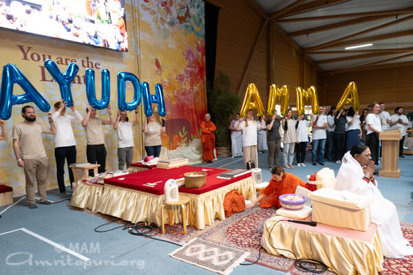 Throughout the gathering, the hall overflowed with devotion. On the final day, AYUDH members welcomed Amma with joy—waving national flags and releasing red-and-white heart-shaped balloons as they sang with all their hearts. Responding to their love and respect, Amma advised them to discover their true inner potential and to become a light unto themselves first—so they may better serve society {read more}.
