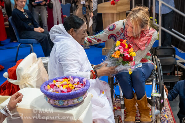 Next, Karen Darke, who is a British Paralympic cyclist, Paratriathlete, adventurer and author said, “Life is an adventure, it’s a journey to learn and grow from. Nothing I have ever accomplished could have been done without incredible people, connection, compassion, love, belief, trust. We think we are not enough, it’s part of being human but I love to remind myself of the quote : ” Our mind is a garden, our thoughts are the seeds, we can plant flowers or we can grow weed ” With these flowers, wonderful things can happen, even more so since I met Amma as Magic happens around Amma.”