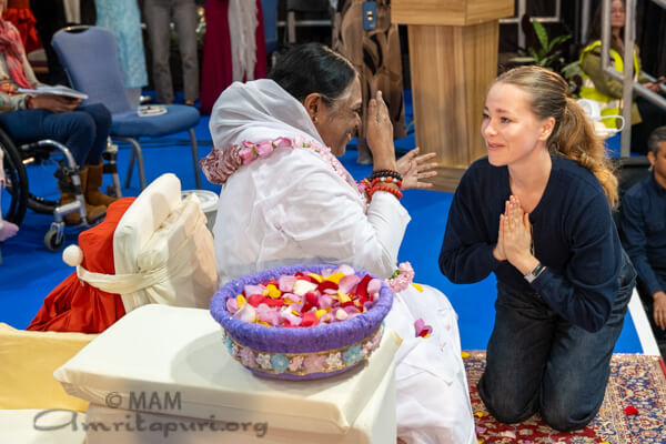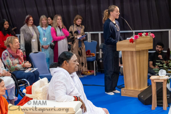On the first day of the program Amma was welcomed to the UK by several dignitaries. These included Shivani Raja MP, adventurer Karen Darke and entrepreneur Poppy Jamie.