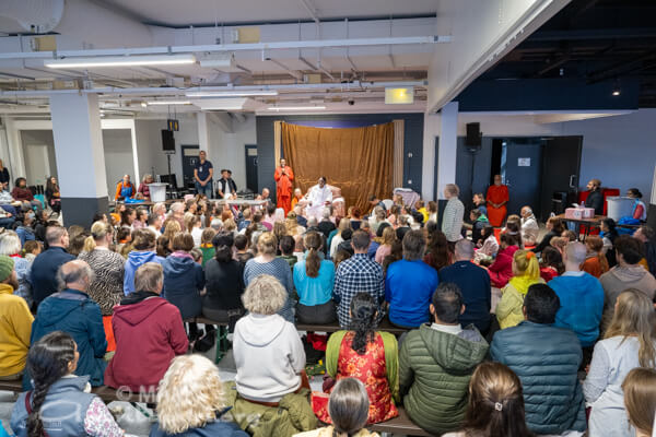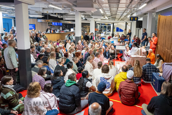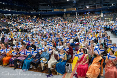 Amma wanted everyone—especially her Finnish children—to laugh. Noticing the crowd’s seriousness during the program, she asked all to clap and laugh aloud. All happily clapped and cheered. It might have lasted for a minute.
