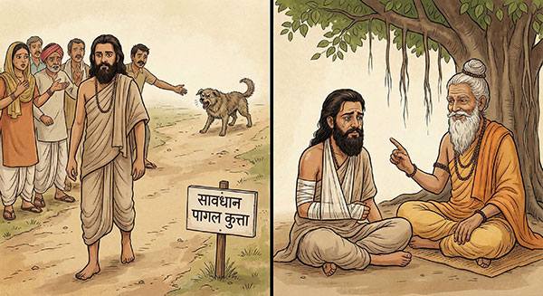 A sadhak once walked through an area where a mad dog roamed free. People warned him, “Don’t go there—there’s a mad dog!”