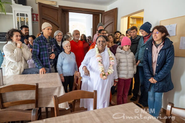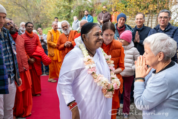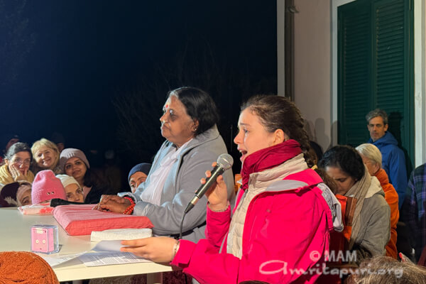 Amma then led everyone in meditation, distributed prasad dinner, and sang bhajans while sitting in the backyard of the ashram in Gavy, Italy. In the cold weather of around ten degrees, all felt grateful to be wrapped in the warmth of Amma’s love.