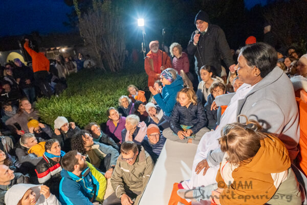 As the cold night set in, Amma came to the grounds for dinner to meet all her Italian children. Everyone huddled together in the cold wind, bathing in Amma’s warmth and love.