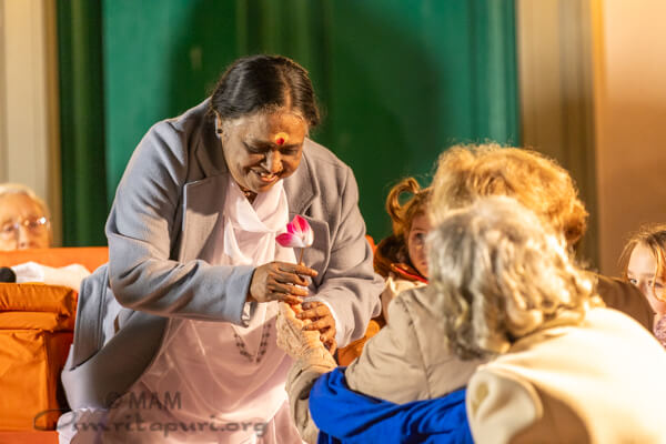 “When I first met Amma, I offered her a flower as a symbol of my love, which Amma accepted and adored. In subsequent darshans too, I offered flowers. Whenever I could not find a flower, I would give her an invisible one—an imaginary one—which Amma treated with the same love. Amma did not need a physical flower to understand my intention or feel my love.”