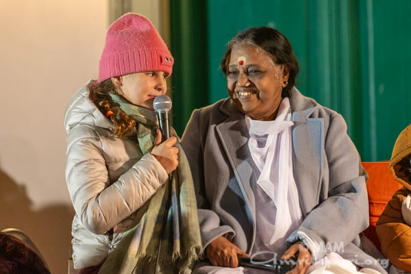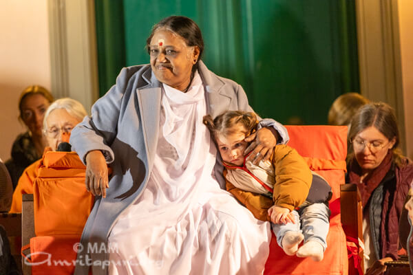 Later, Luna, a young Italian girl seated on Amma’s peetham, sweetly expressed her gratitude to Amma for coming to Italy.
