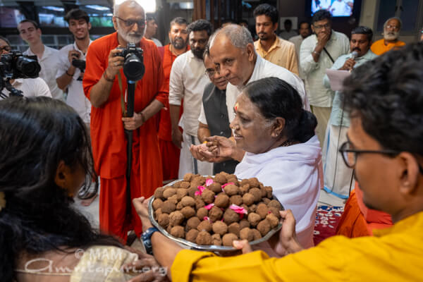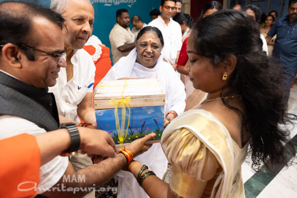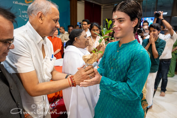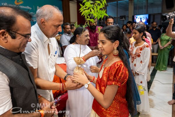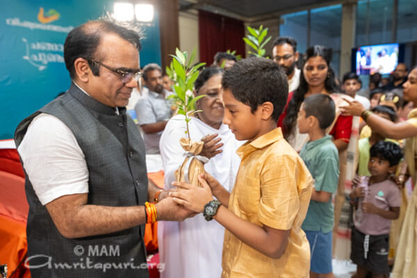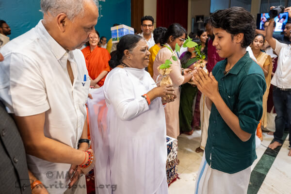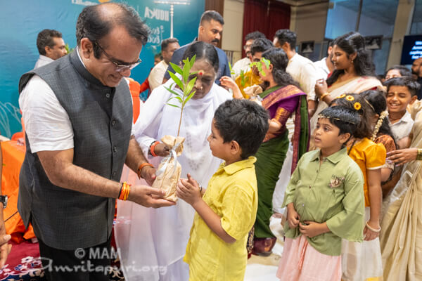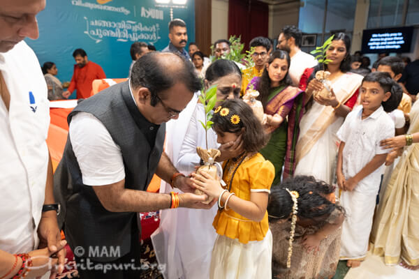 Amma blessed the Vishukkani arranged in front of the stage, which included traditional items and a collection of plants. She also distributed various plants to children and youths as part of the Vishuthai Neettam. These included seedballs, bee hives, and bird feeders, promoting a sense of care for nature alongside the festival spirit.