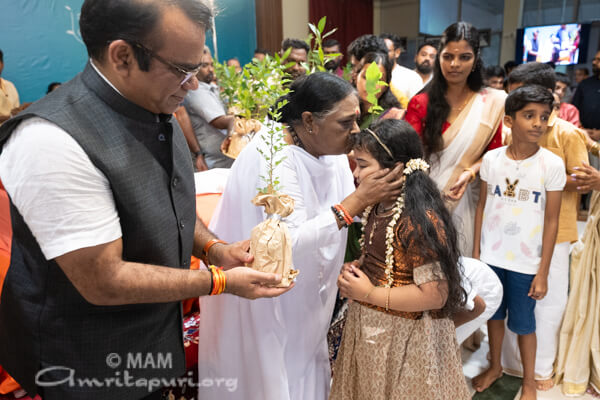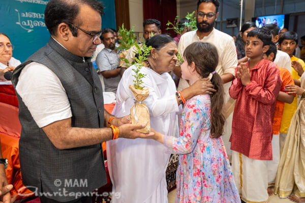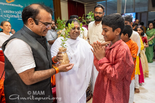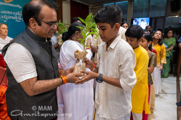On our birthday, we must try to plant at least one sapling for others. We should remain alert and mindful of that. Vishu-kkaineeṭṭam, Vishu-taineeṭṭam—“Vishu’s gift of blessings, Vishu’s offering of saplings” should be our slogan. This practice is about cultivating love and harmony with Nature and all living beings, restoring ecological balance and embracing actions that foster both material and spiritual growth.
